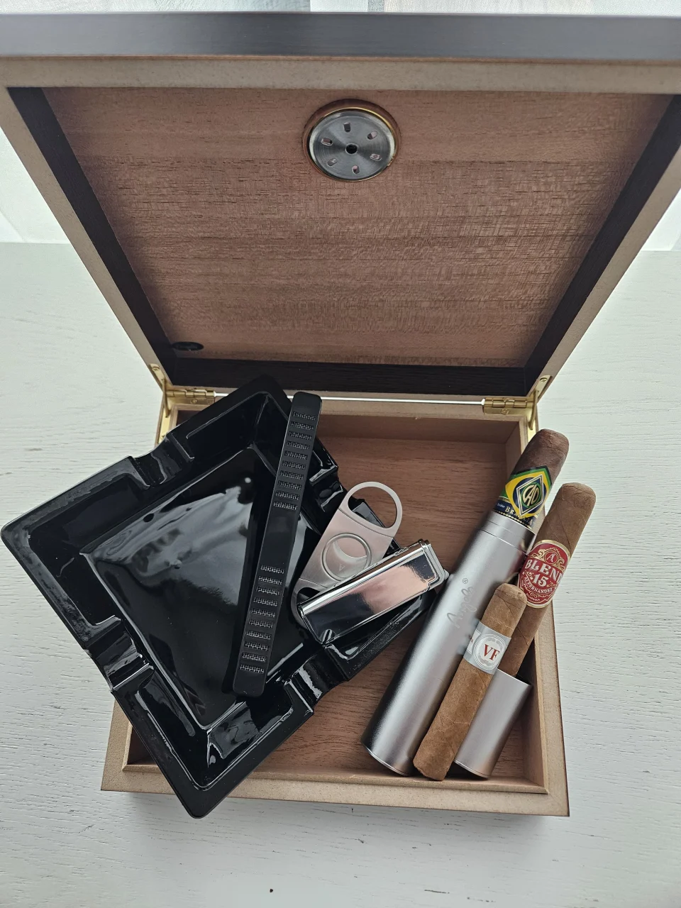 Acest pack ofera un umidor cu o capacitate de 10 – 15 de trabucuri + un higrometru si umidificator, iar pentru un inceput cat mai simplu, in packet se mai gaseste si un recipient cu un lichid special pentru umidificare. Pe langa asta, pack-ul mai contine si un etui pentru depozitarea trabucurilor atunci cand esti in deplasare, in oras sau in vacanta.