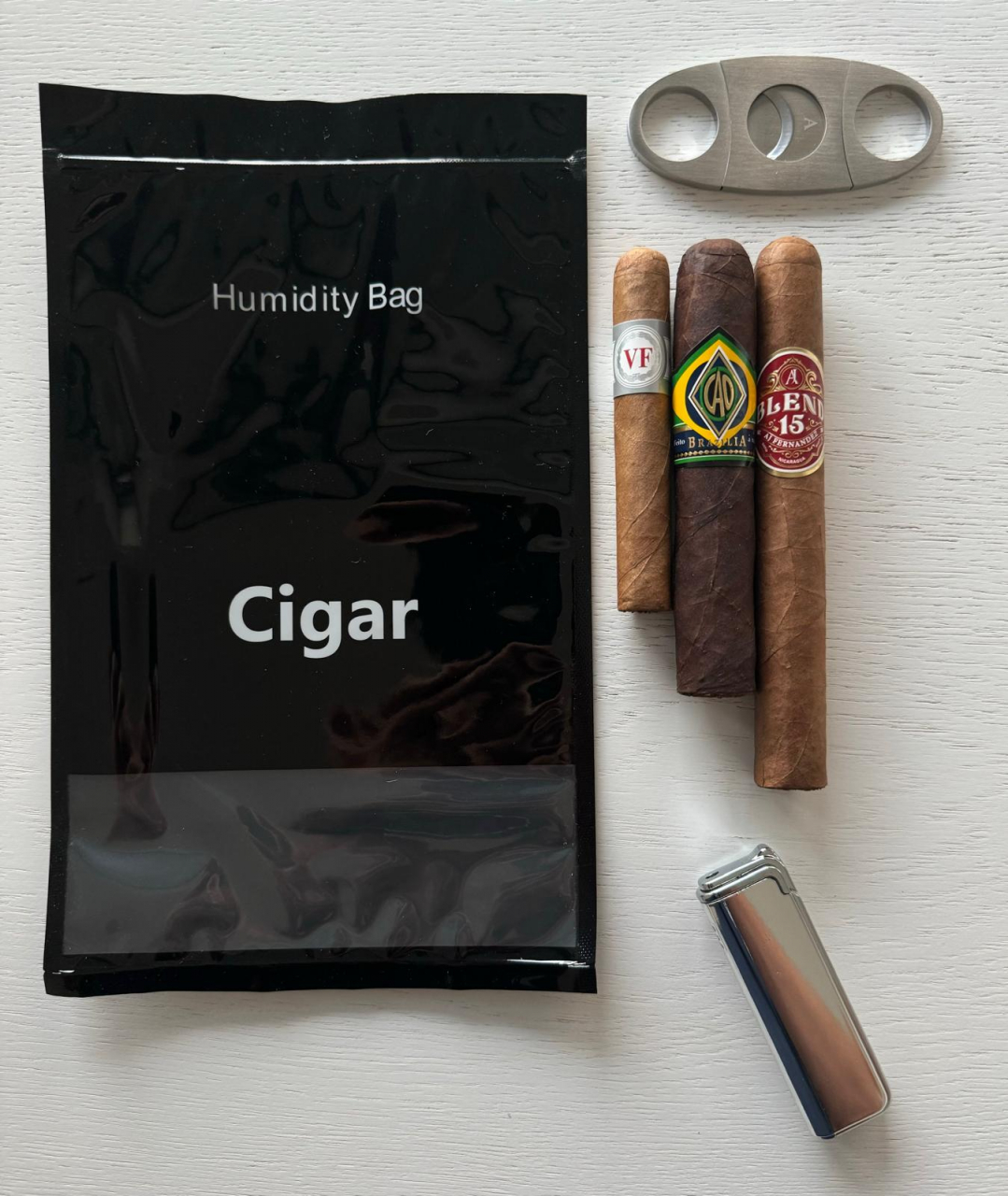 Pe langa aceste 3 trabucuri, pachetul mai contine o punga de umidificare, in care trabucurile isi pastreaza umiditatea pana la 3 luni.